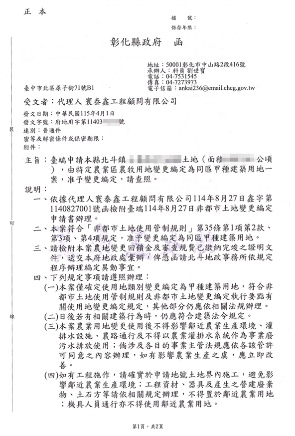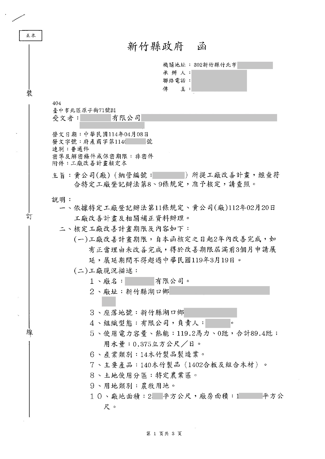 主旨:貴公司(廠)(納管編號:○○○)所提供工廠改善計畫,經查符合特定工廠登記辦法第8、9條規定,准予核定,請查照。